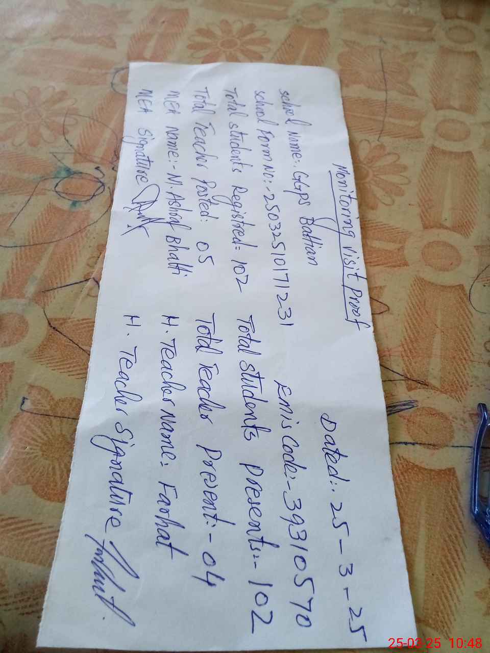 | Attendance Register | Head Teacher | MEA with School | Visit Proof |