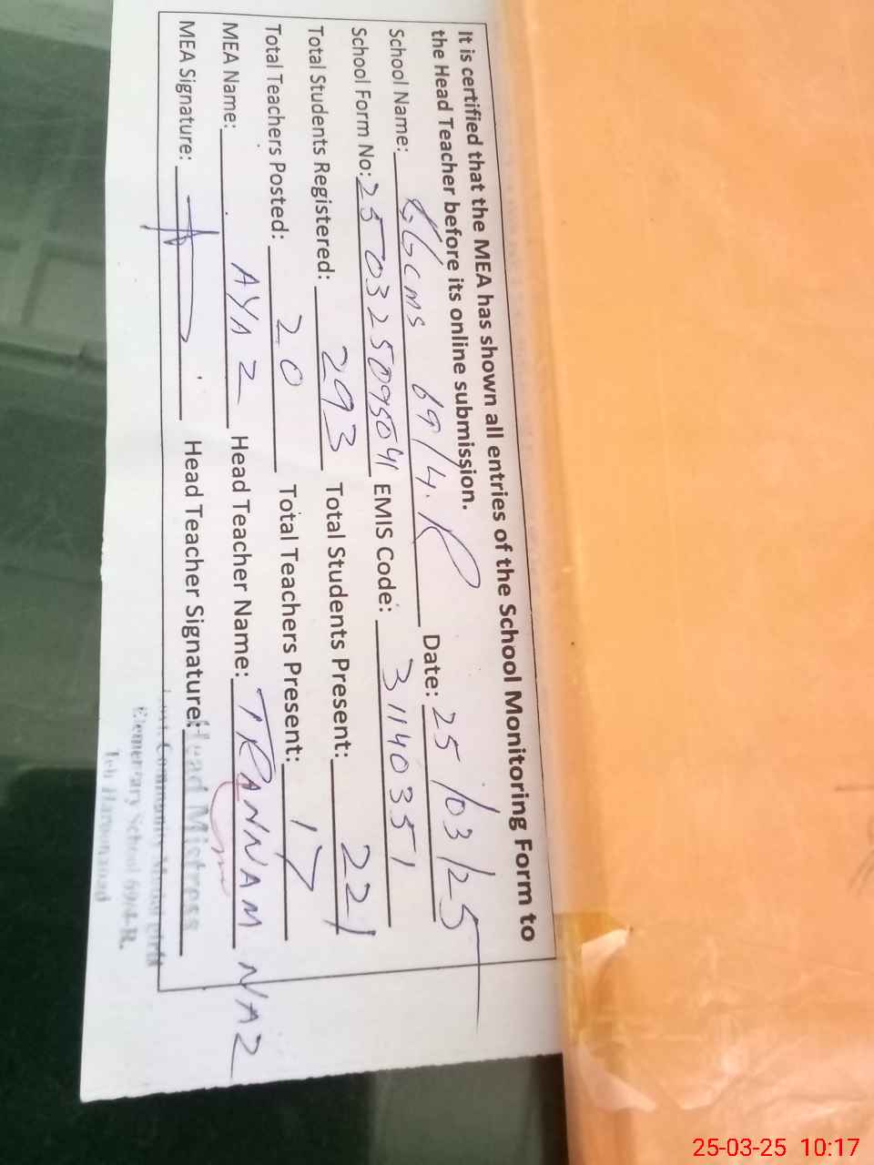 | Attendance Register | Head Teacher | MEA with School | Visit Proof |