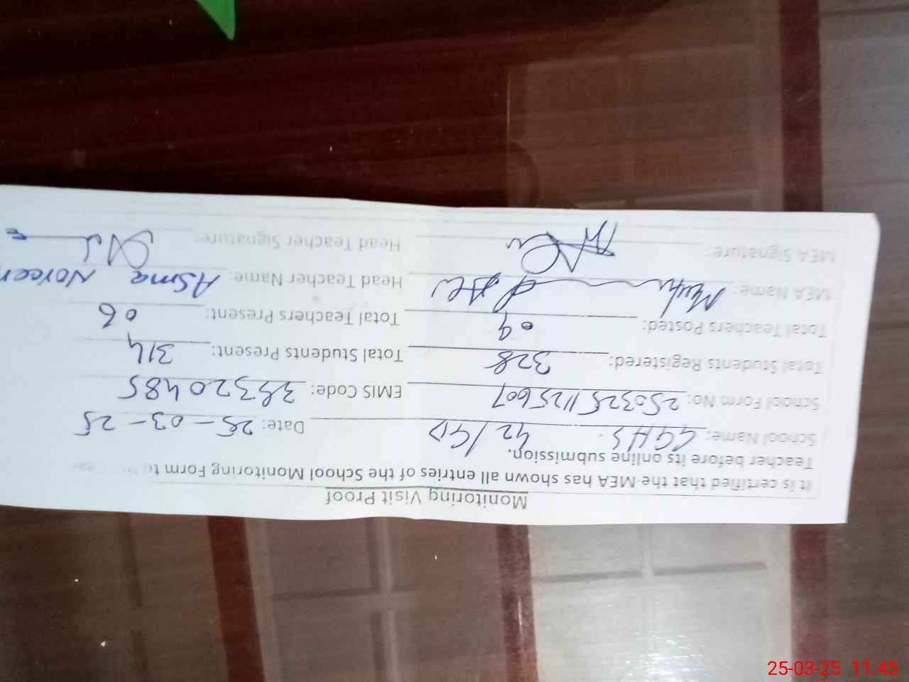 | Attendance Register | Head Teacher | MEA with School | Visit Proof |