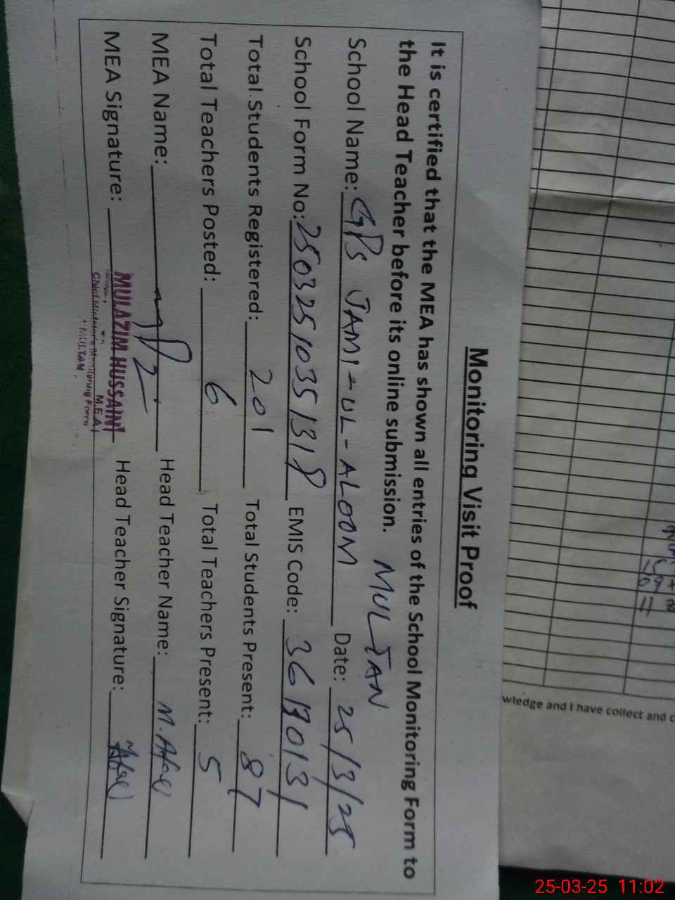 | Attendance Register | Head Teacher | MEA with School | Visit Proof |