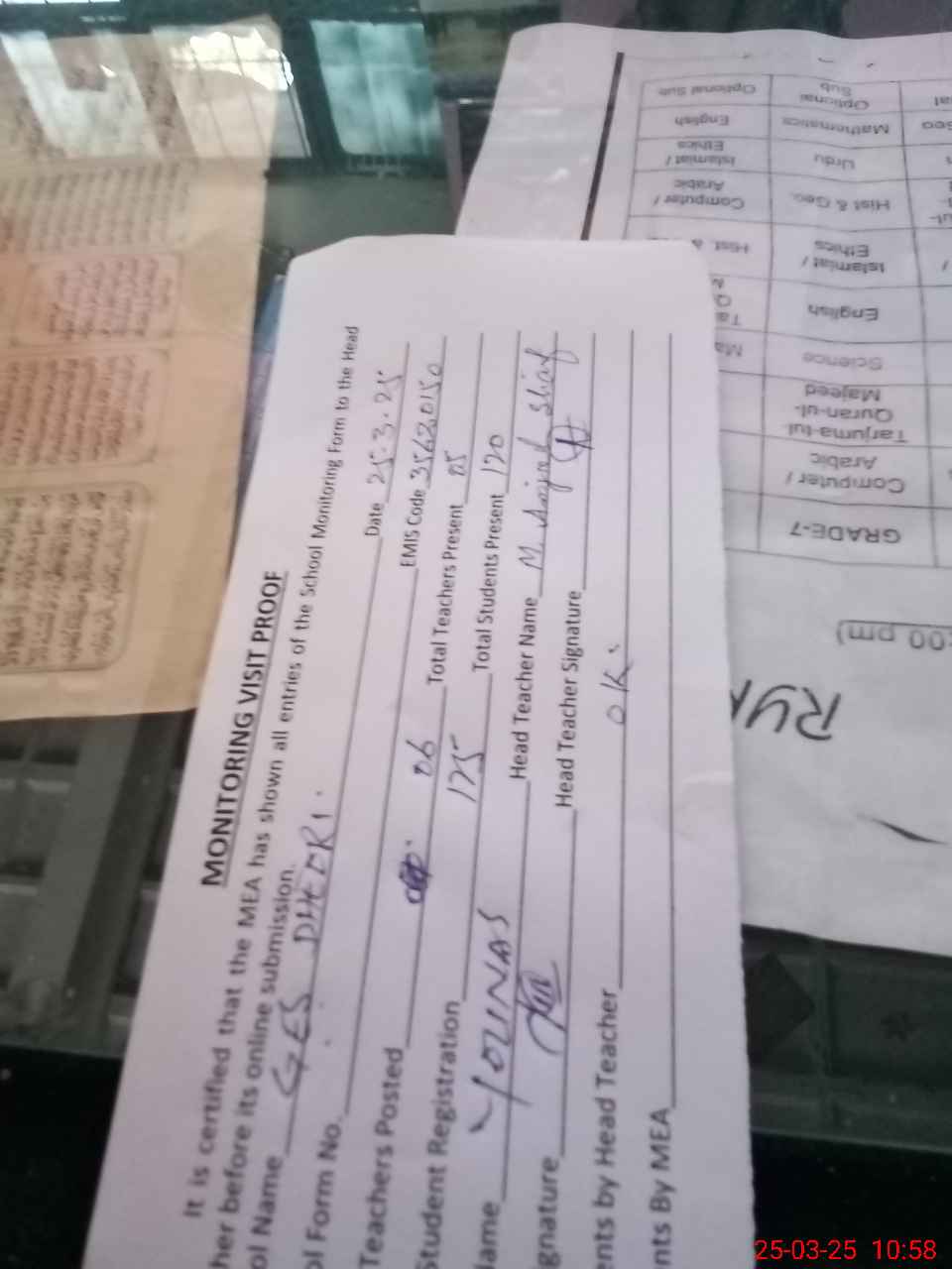 | Attendance Register | Head Teacher | MEA with School | Visit Proof |