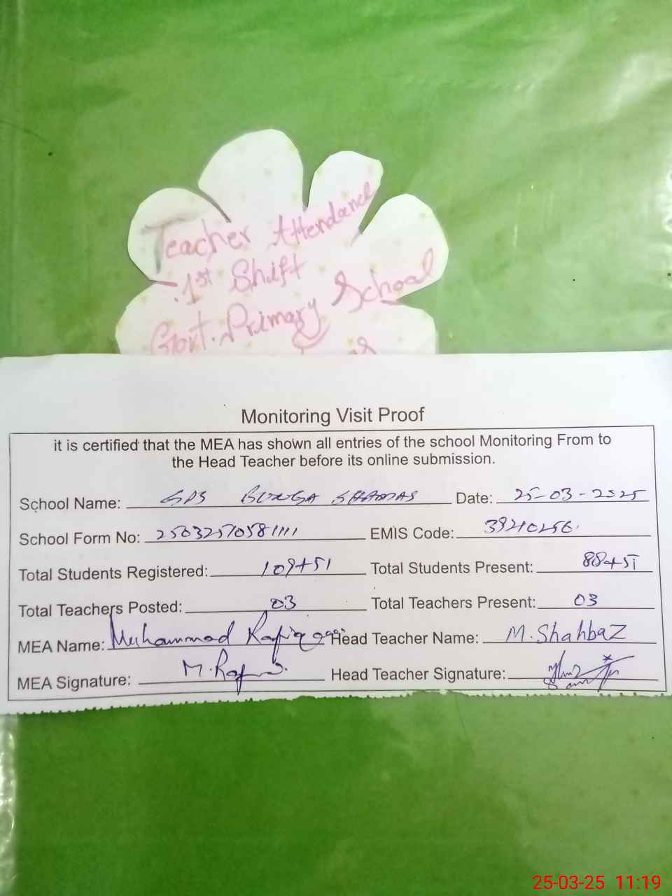 | Attendance Register | Head Teacher | MEA with School | Visit Proof |