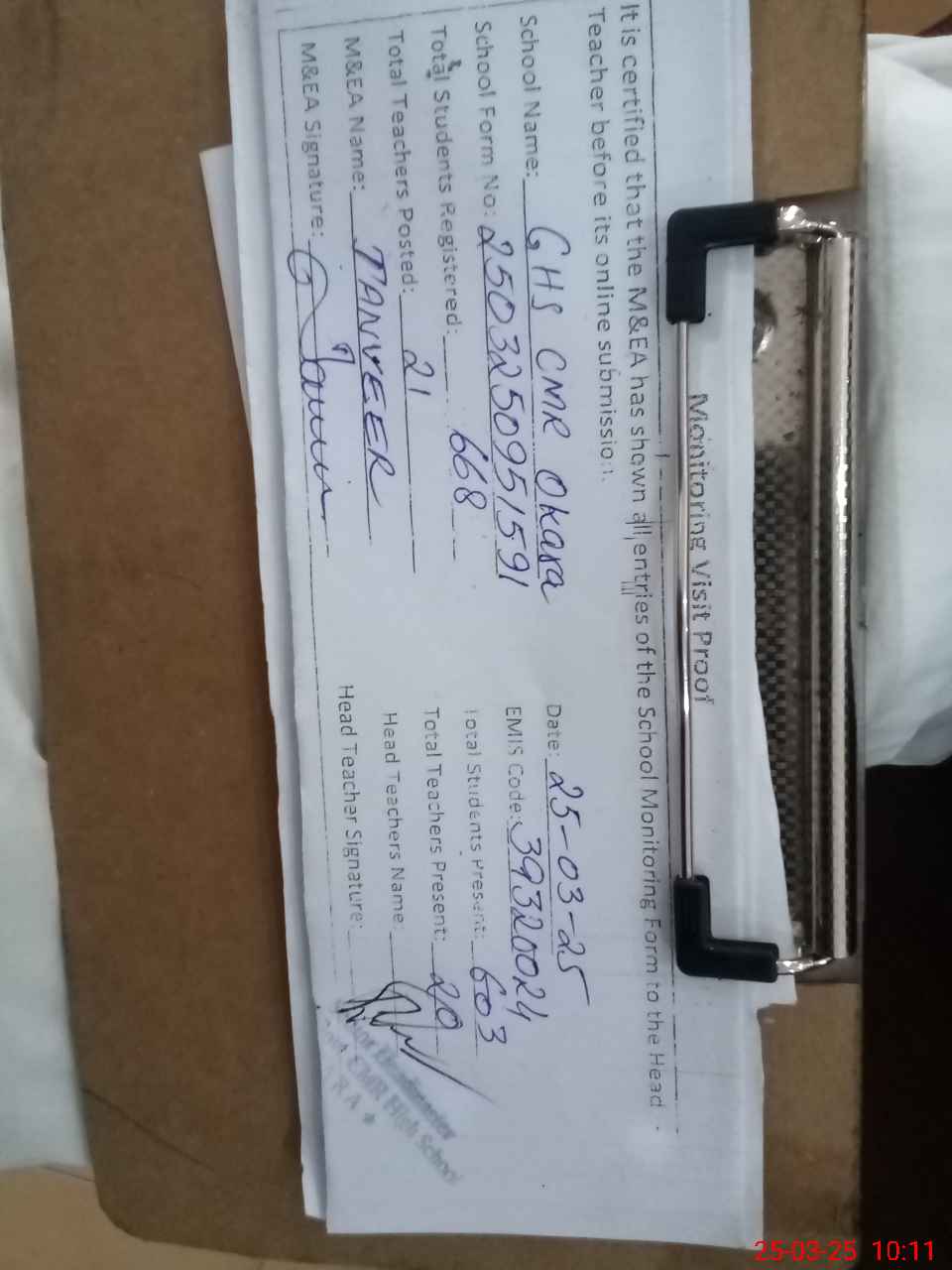 | Attendance Register | Head Teacher | MEA with School | Visit Proof |