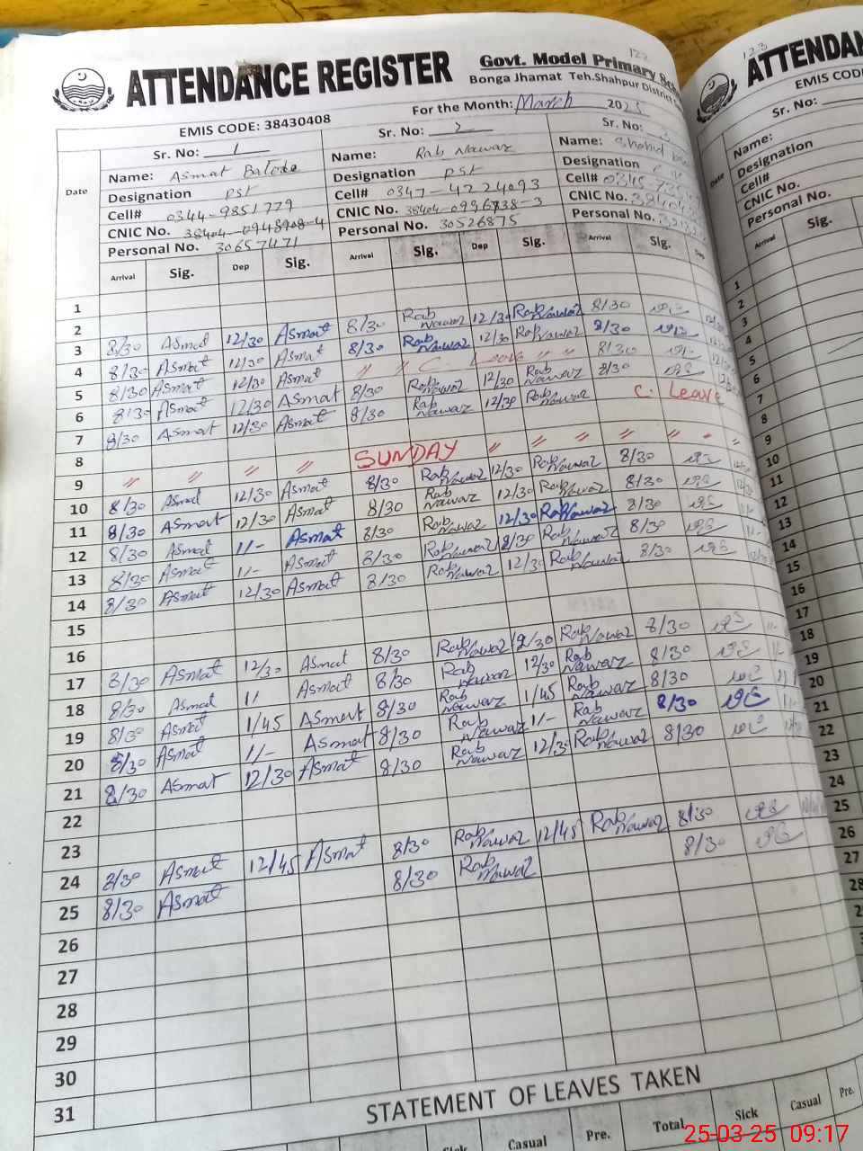 | CNIC | Full Name | Designation | R/C | Absence during last cal. month |