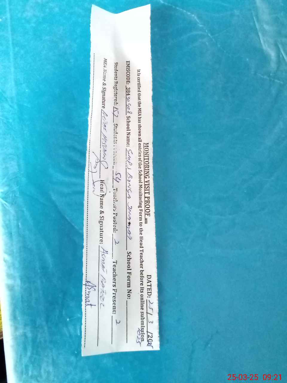 | Attendance Register | Head Teacher | MEA with School | Visit Proof |