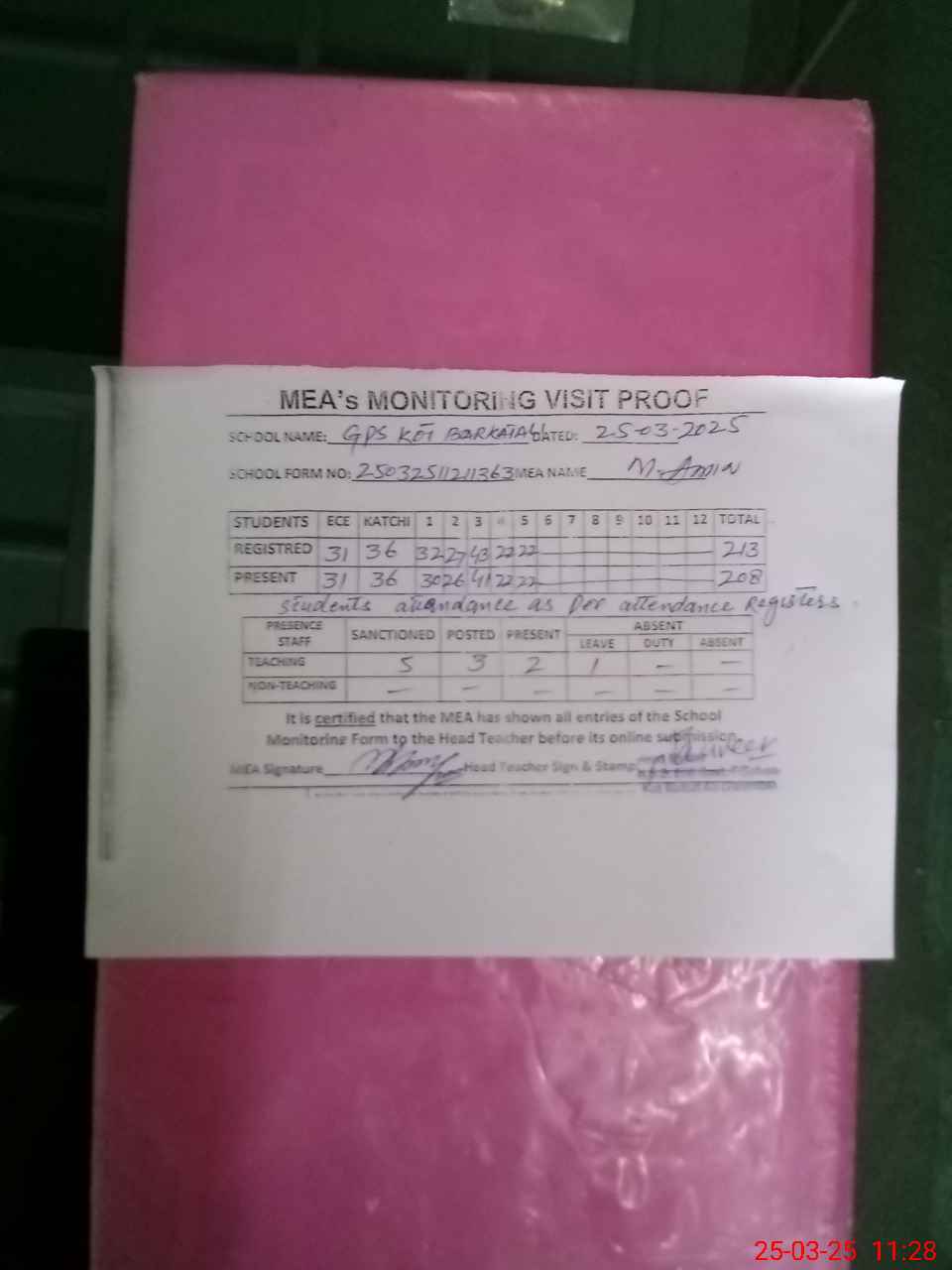 | Attendance Register | Head Teacher | MEA with School | Visit Proof |