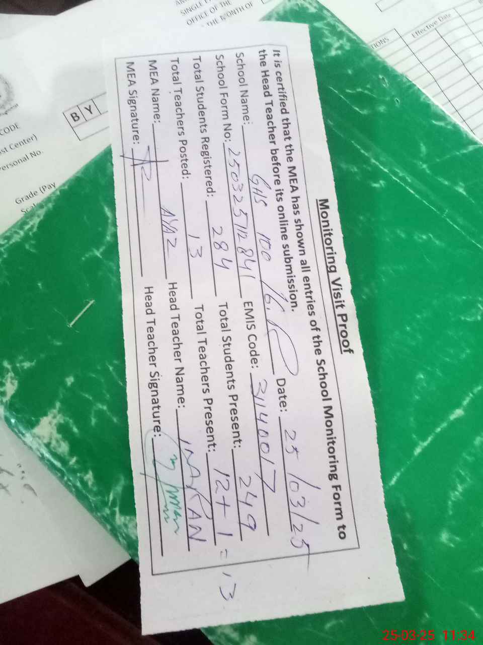 | Attendance Register | Head Teacher | MEA with School | Visit Proof |