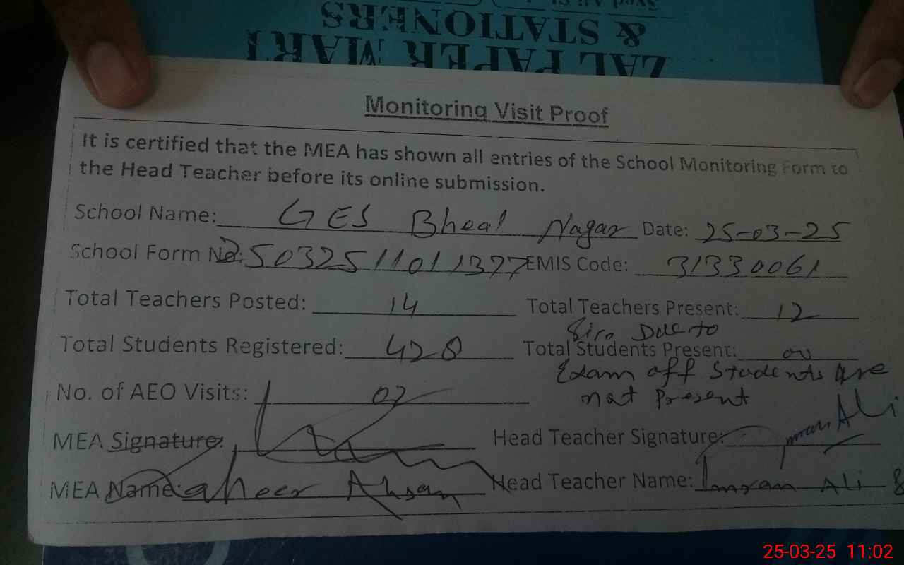 | Attendance Register | Head Teacher | MEA with School | Visit Proof |