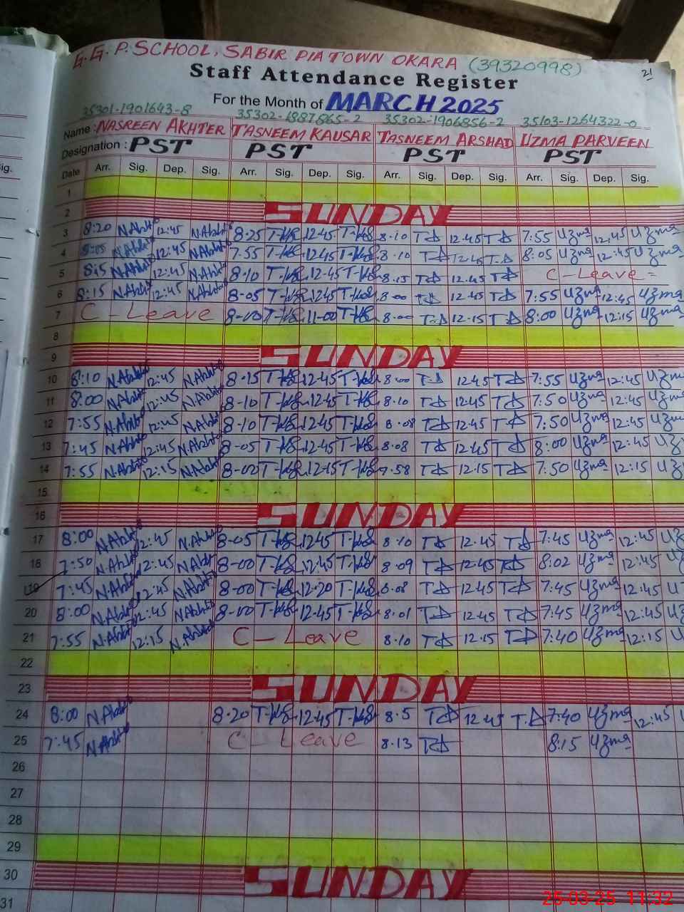 | 35**** | Sa**** Ba**** | PST | Regular | 0 | 0 | 0 | 0 | 0 | 0 | 0 | 0 | 0 | Exam Duty |