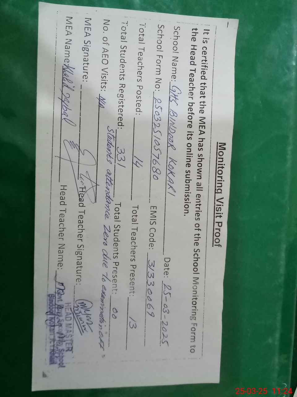 | EMIS Code: 31330069 | Name of School: GHS BINDOOR KOKARI | |||