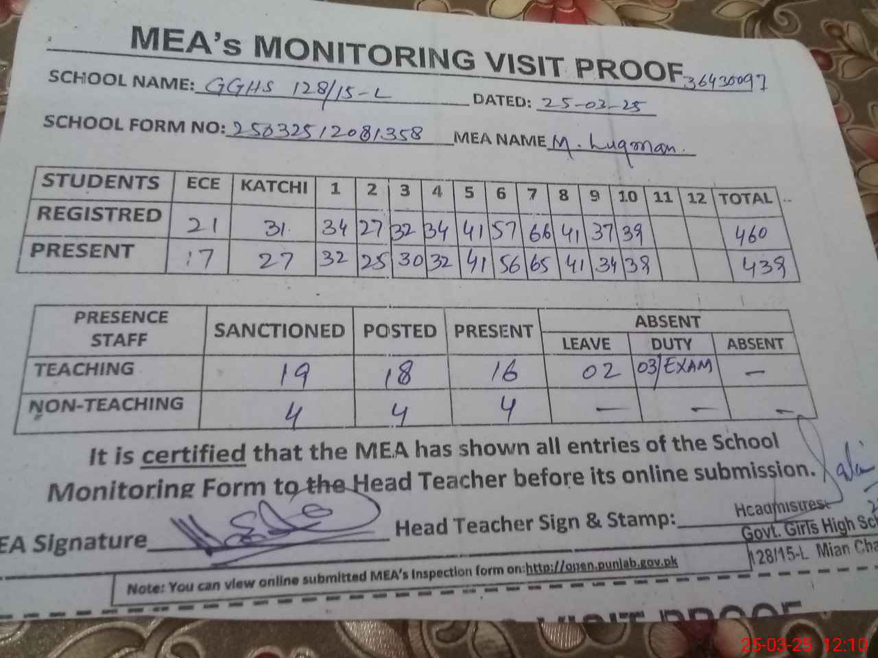 | Attendance Register | Head Teacher | MEA with School | Visit Proof |
