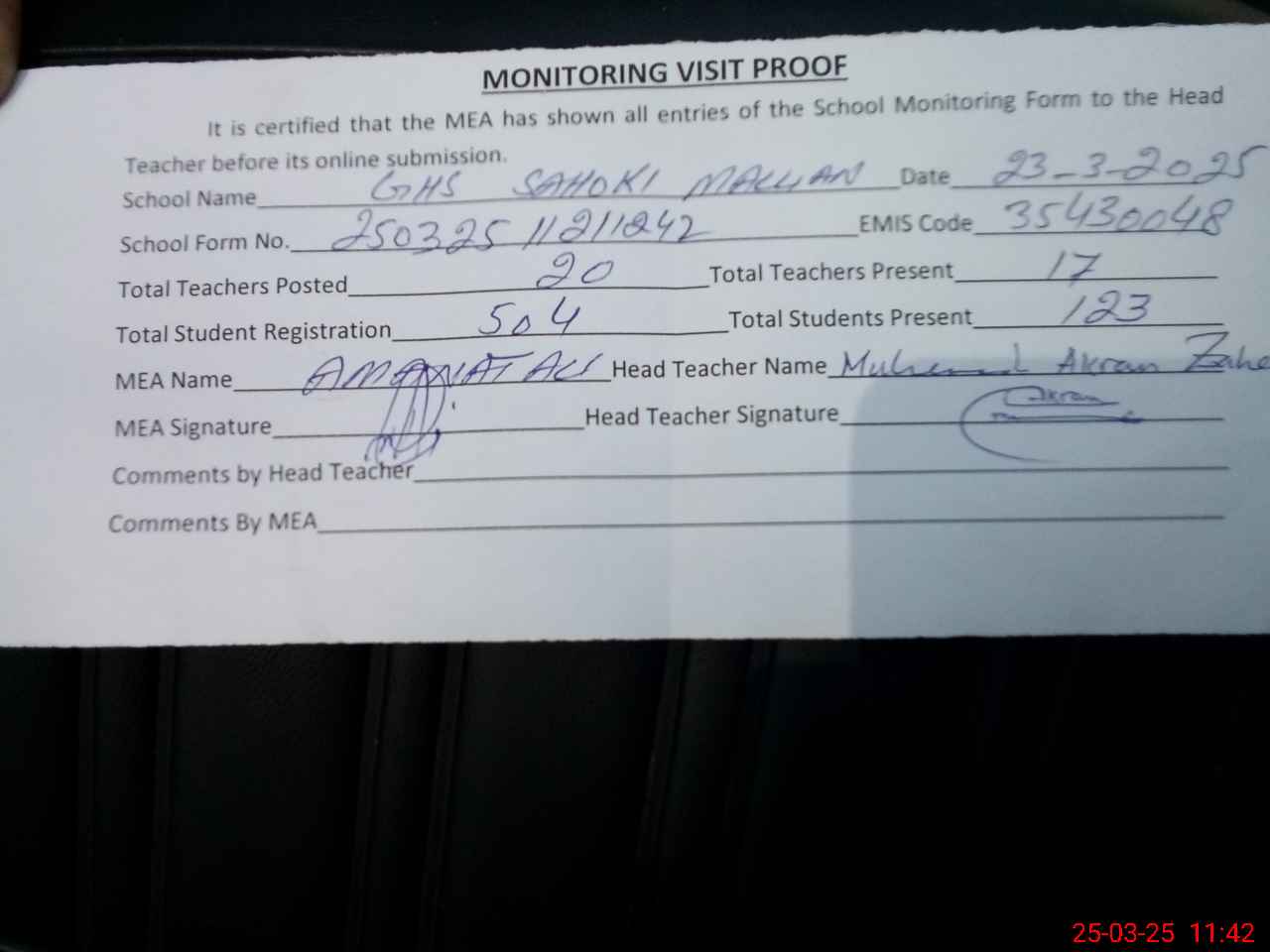 | Attendance Register | Head Teacher | MEA with School | Visit Proof |