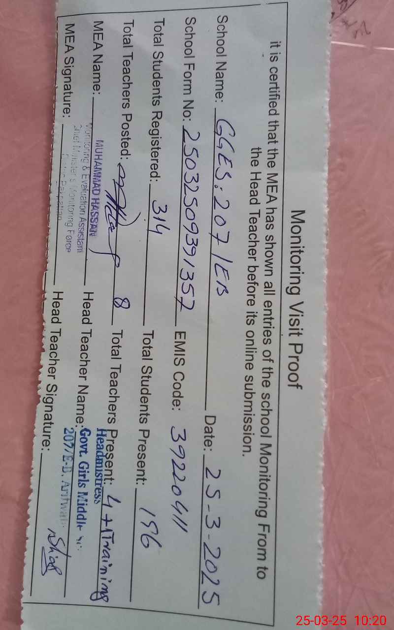 | Certified that this School was Inspected by the Undersigned MEA/DMO Today and the Information Stated Above is as Per Record. | |||||
