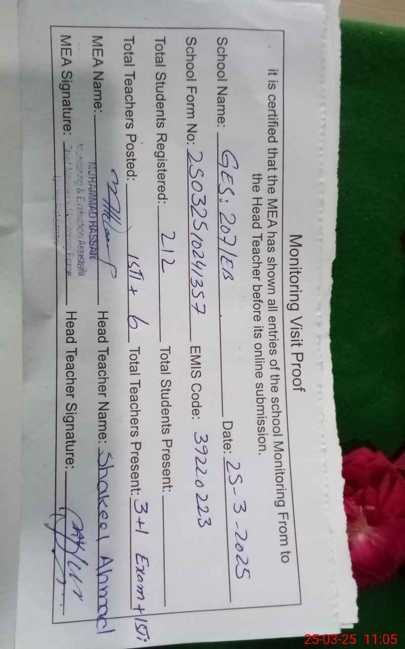 | EMIS Code: 39220223 | Name of School: GES CHAK NO. 207 EB P.O SAME ARIF WALA | |||