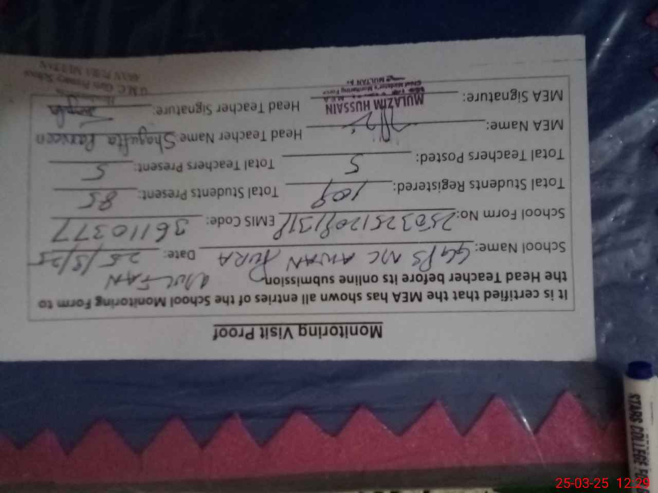 | Attendance Register | Head Teacher | MEA with School | Visit Proof |