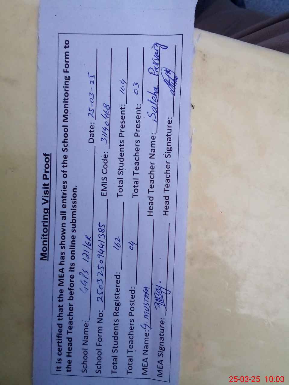 | Attendance Register | Head Teacher | MEA with School | Visit Proof |