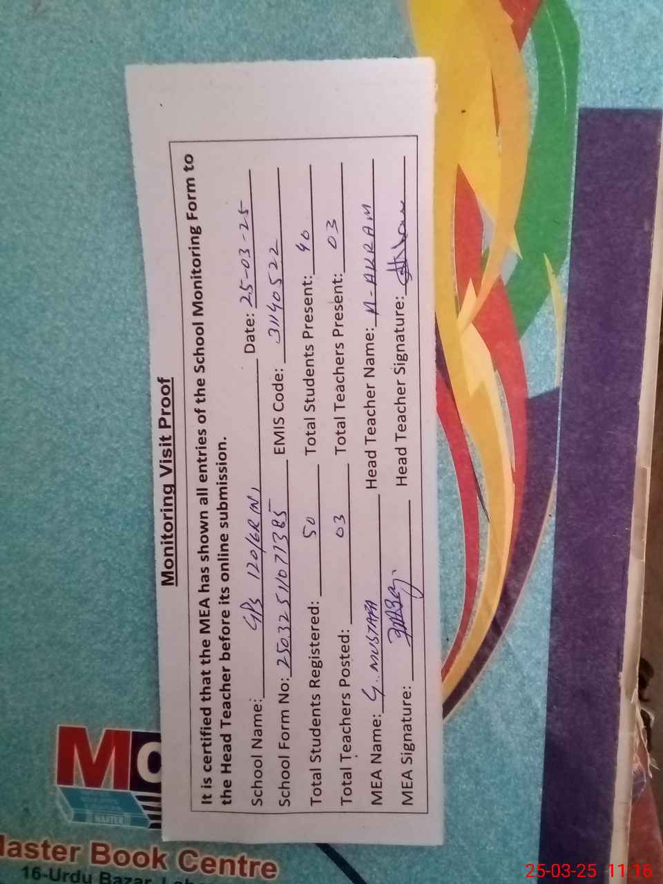 | Attendance Register | Head Teacher | MEA with School | Visit Proof |