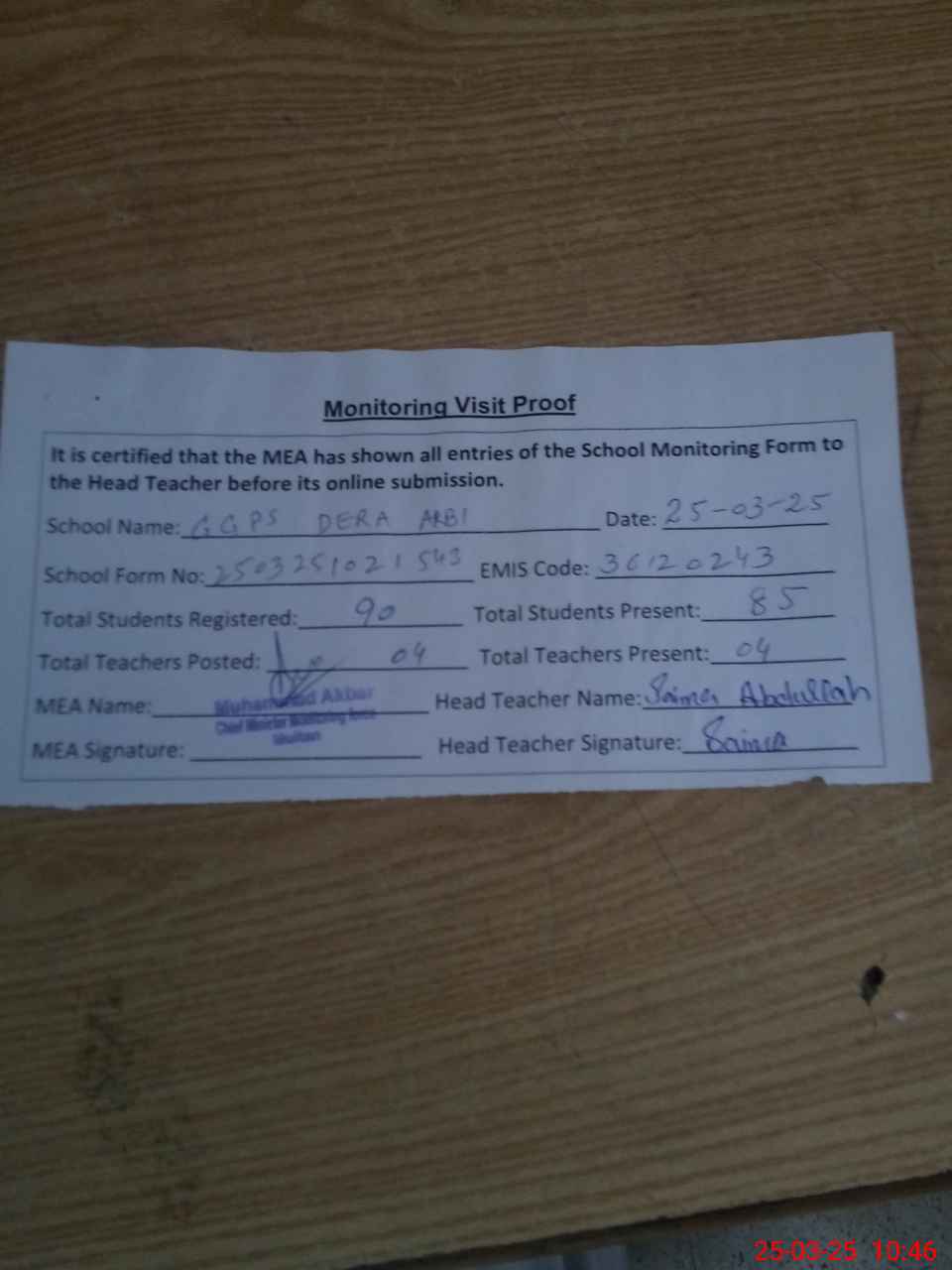 | EMIS Code: 36120243 | Name of School: GGPS DERA AARBI SHUJABAD | |||