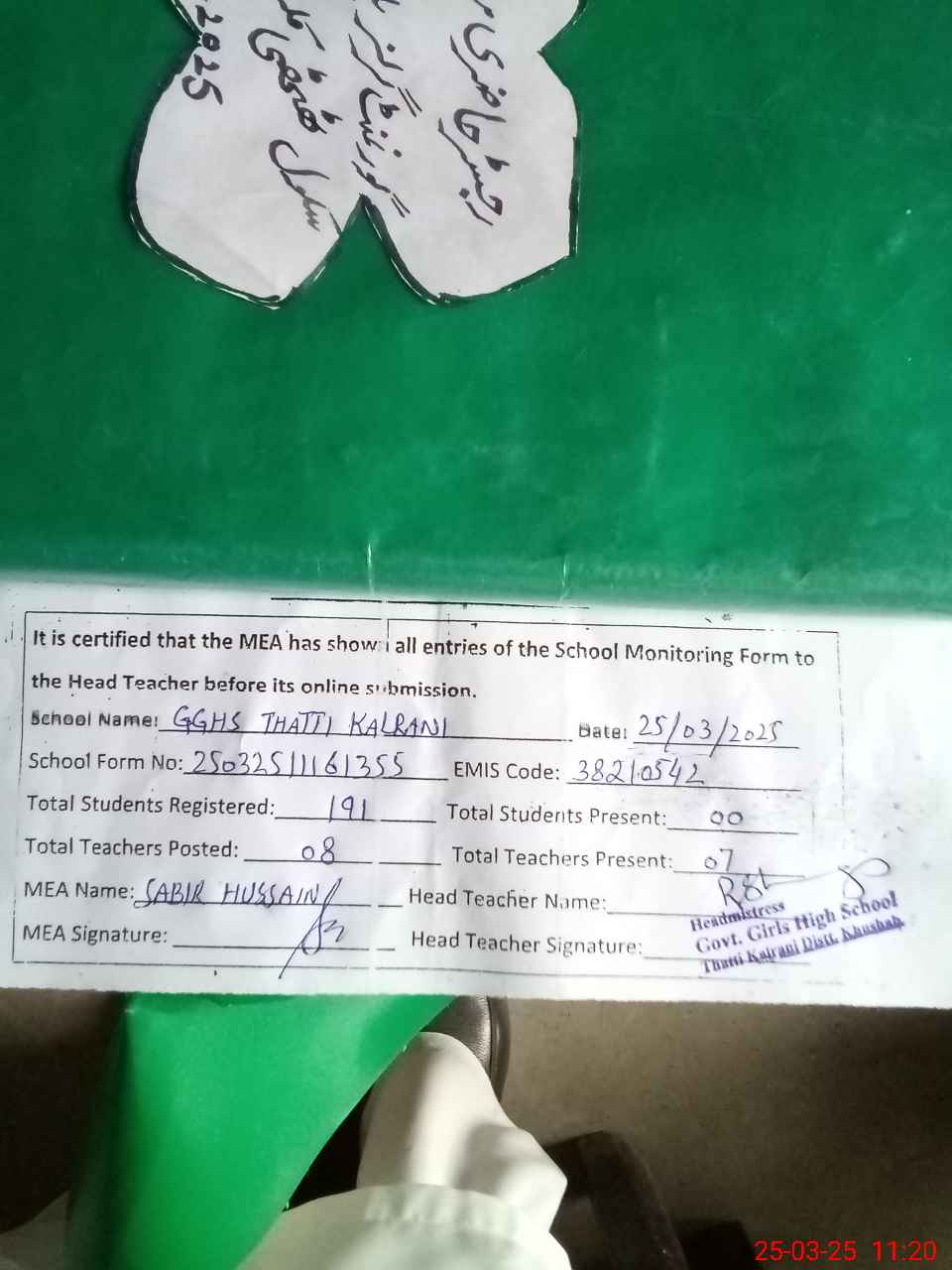 | Attendance Register | Head Teacher | MEA with School | Visit Proof |
