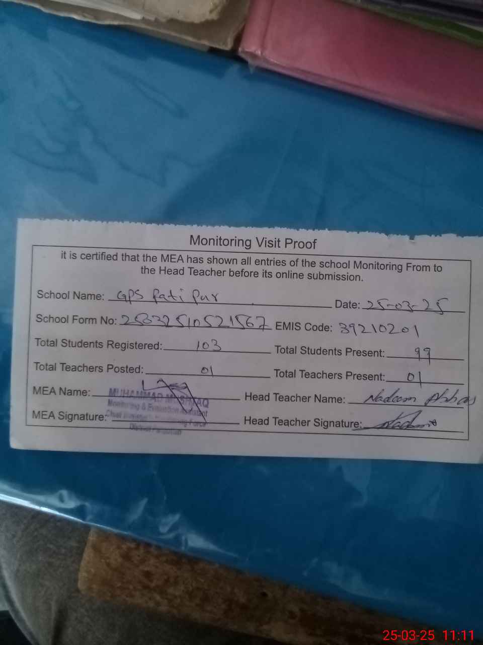 | Attendance Register | Head Teacher | MEA with School | Visit Proof |