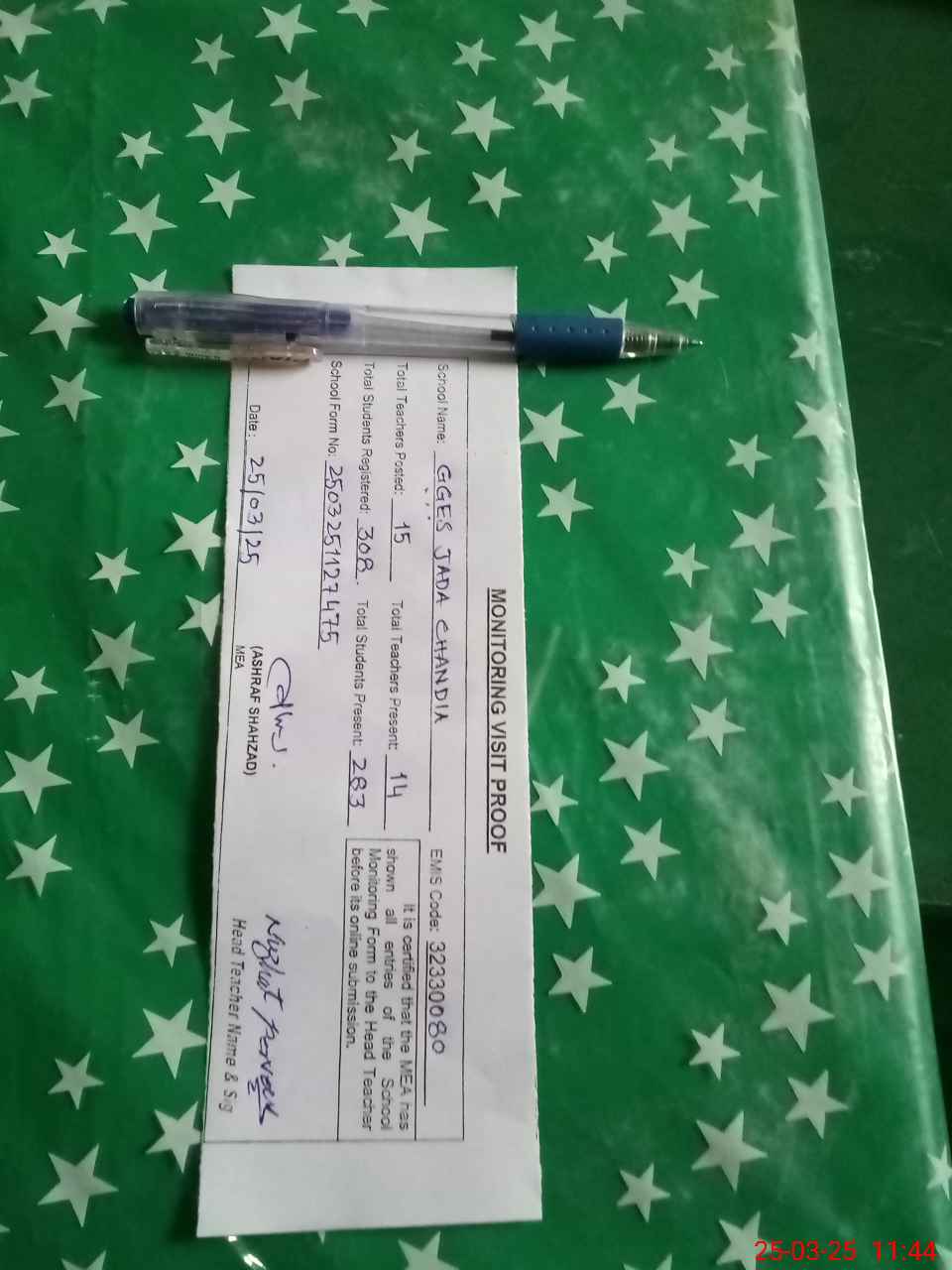 | Attendance Register | Head Teacher | MEA with School | Visit Proof |