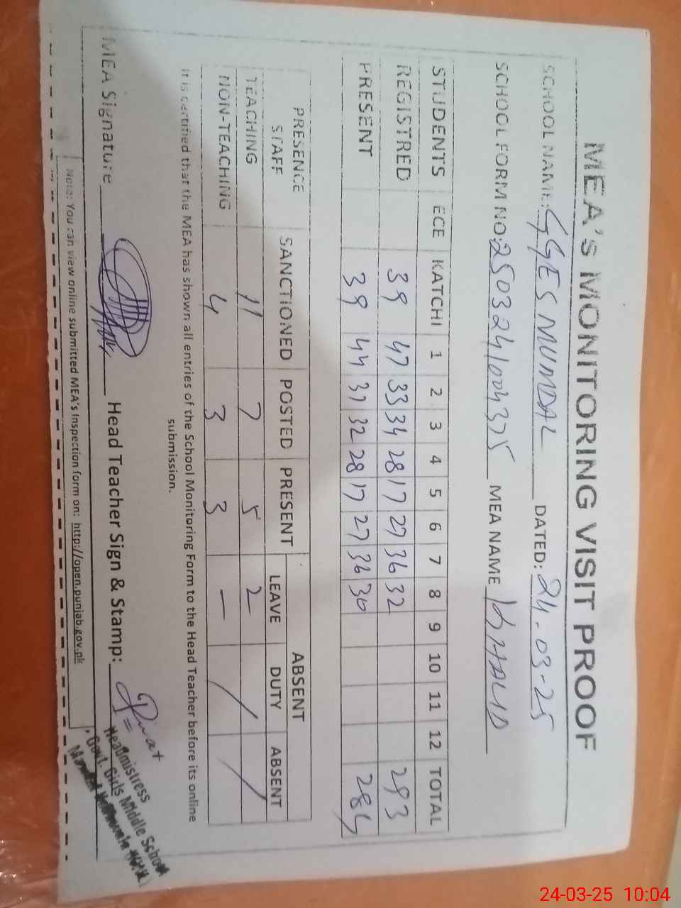 | Attendance Register | Head Teacher | MEA with School | Visit Proof |