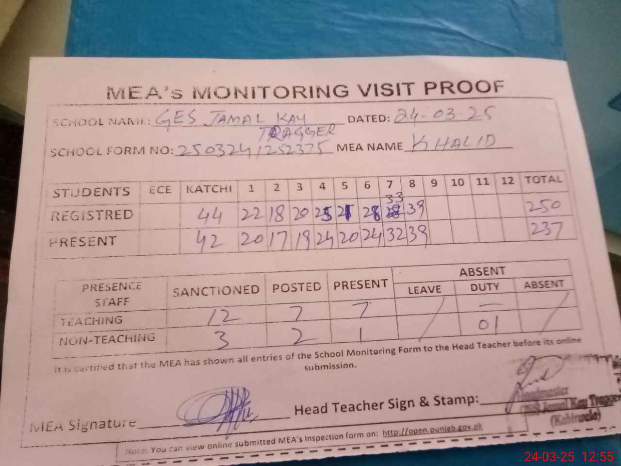 | Attendance Register | Head Teacher | MEA with School | Visit Proof |