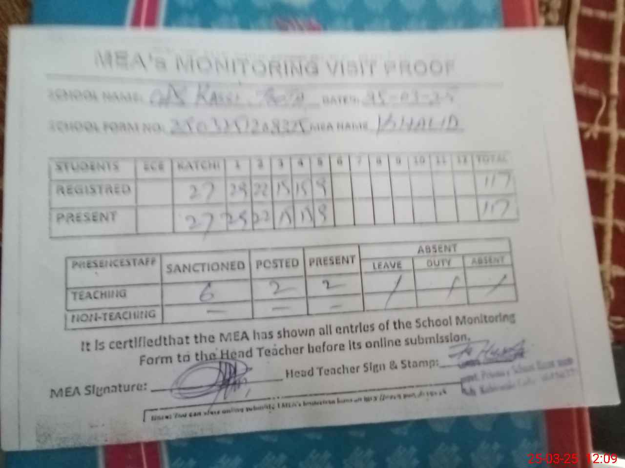 | Attendance Register | Head Teacher | MEA with School | Visit Proof |