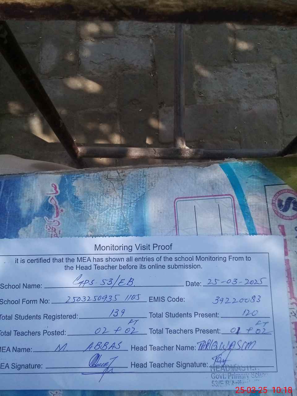 | EMIS Code: 39220083 | Name of School: GPS 53 EB P/O ARIF WALA | |||