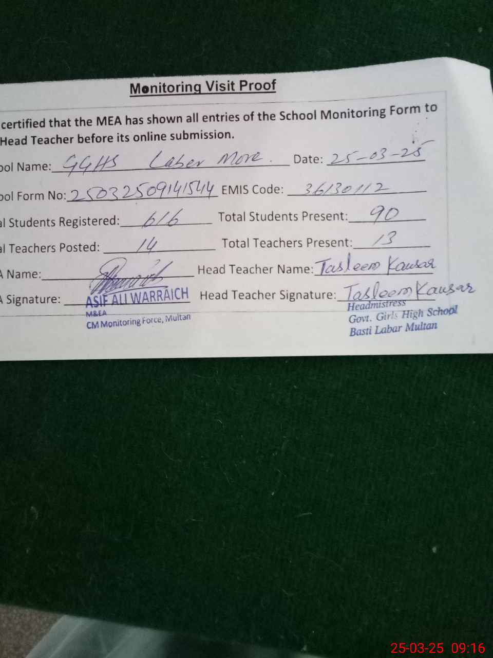 | EMIS Code: 36130112 | Name of School: GGHS LABER MORE MULTAN | |||