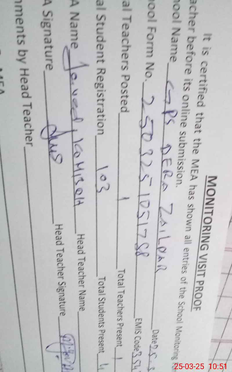 | Attendance Register | Head Teacher | MEA with School | Visit Proof |
