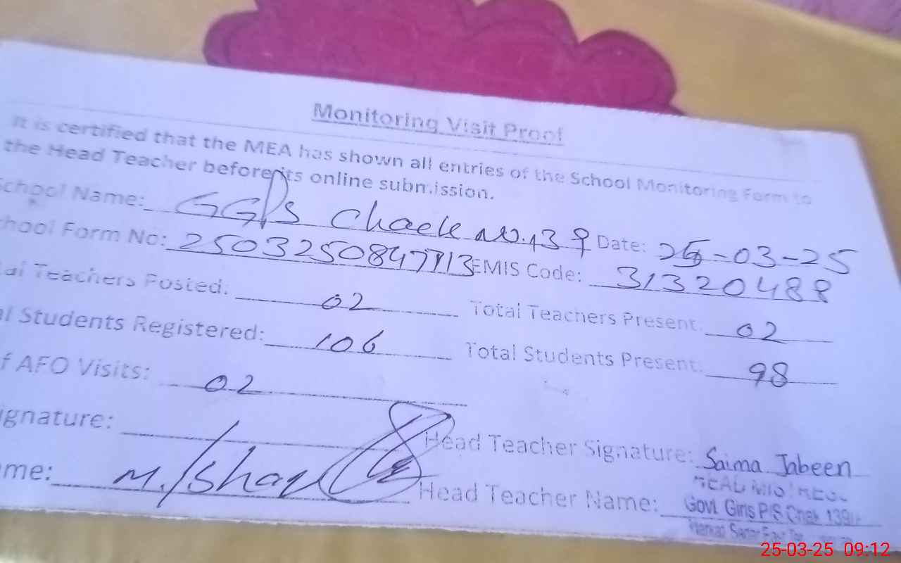 | Attendance Register | Head Teacher | MEA with School | Visit Proof |