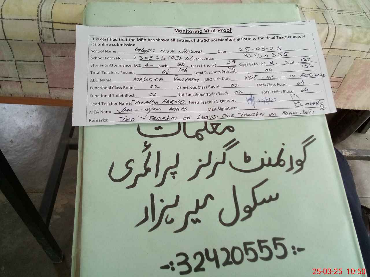 | EMIS Code: 32420555 | Name of School: GGPS MIR HAZAR | |||
