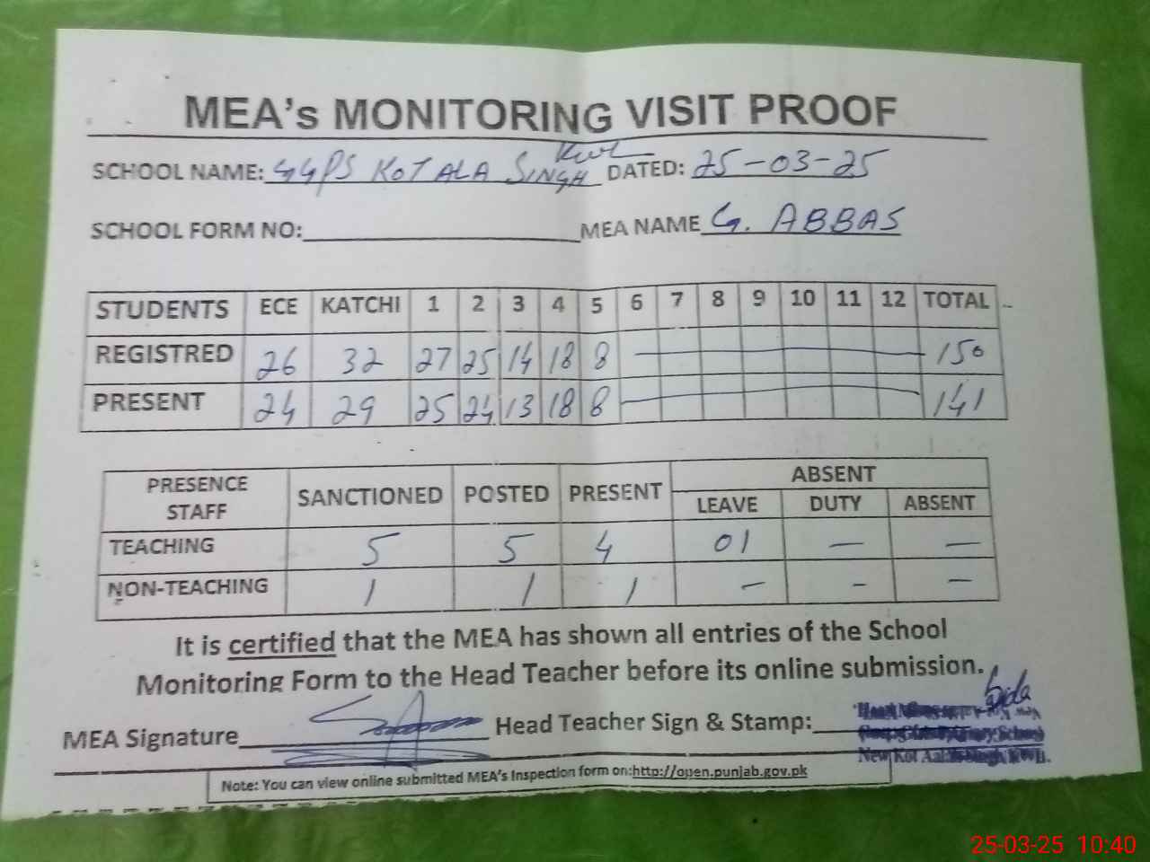 | EMIS Code: 36420351 | Name of School: GGPS KOT ALA SINGH, KHANEWAL | |||