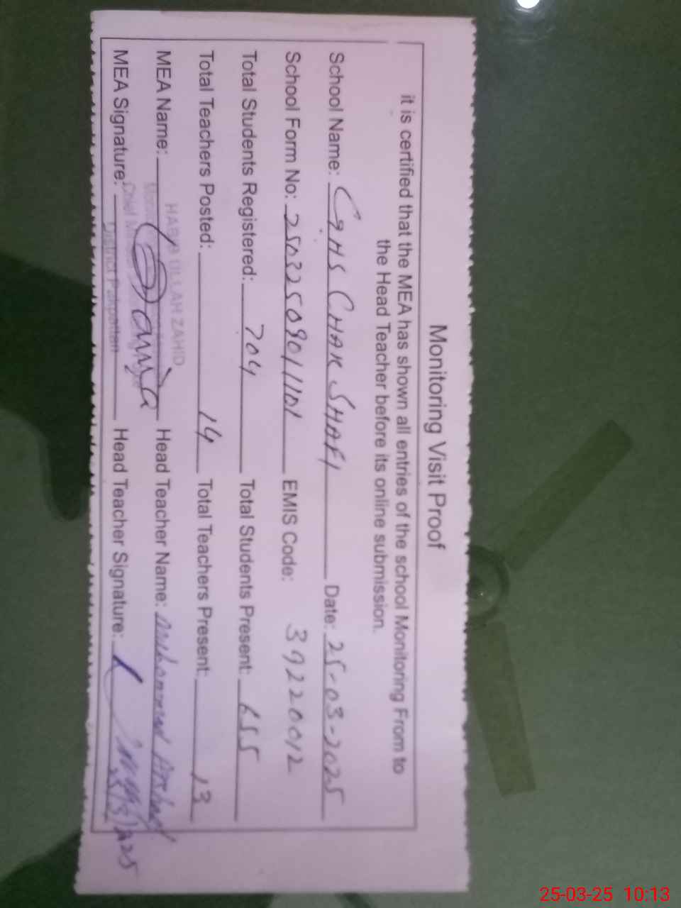 | EMIS Code: 39220012 | Name of School: GHS CHAK SHAFI | |||