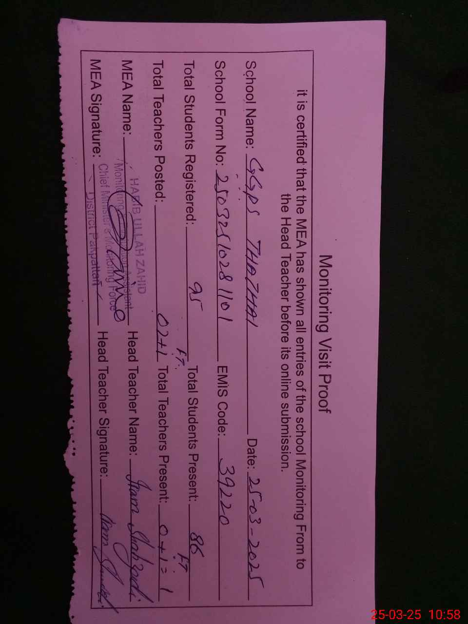 | Attendance Register | Head Teacher | MEA with School | Visit Proof |