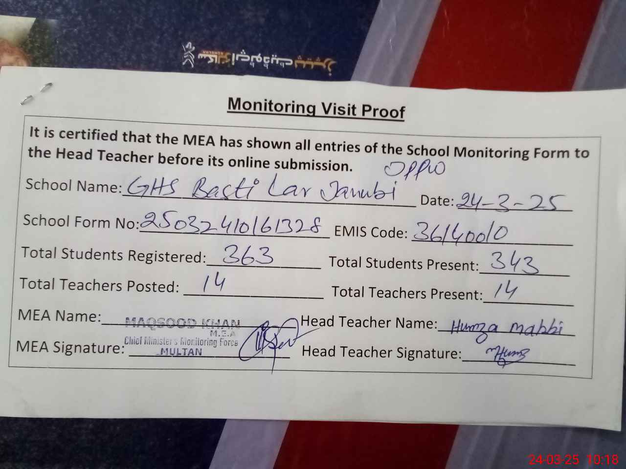 | Certified that this School was Inspected by the Undersigned MEA/DMO Today and the Information Stated Above is as Per Record. | |||||