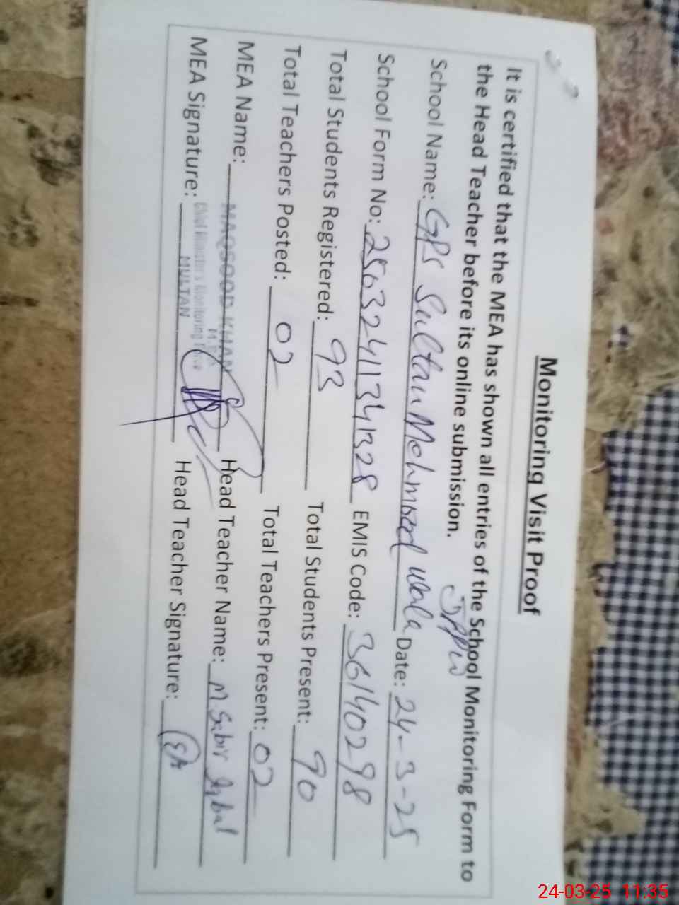 | Name: Mu**** Kh**** Designation: (School Headmaster's/Headmistress's) PS SP Phone/Cell Number: 03**** |