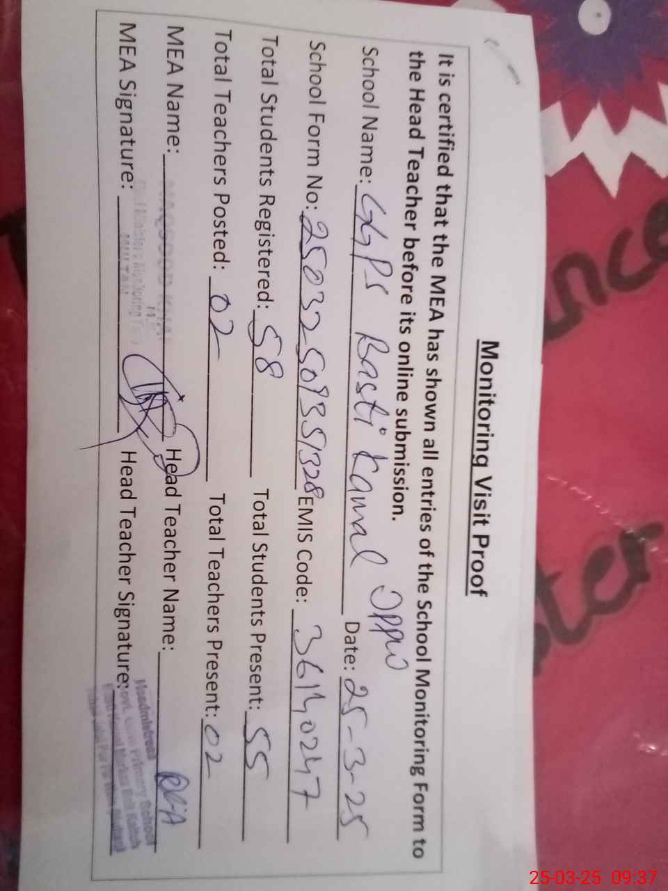 | Attendance Register | Head Teacher | MEA with School | Visit Proof |
