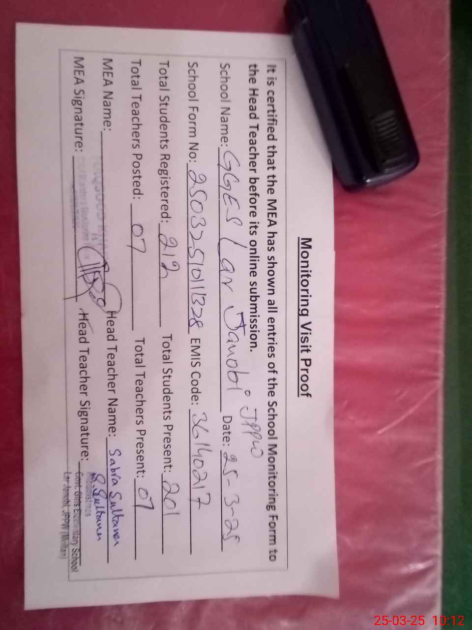 | Attendance Register | Head Teacher | MEA with School | Visit Proof |