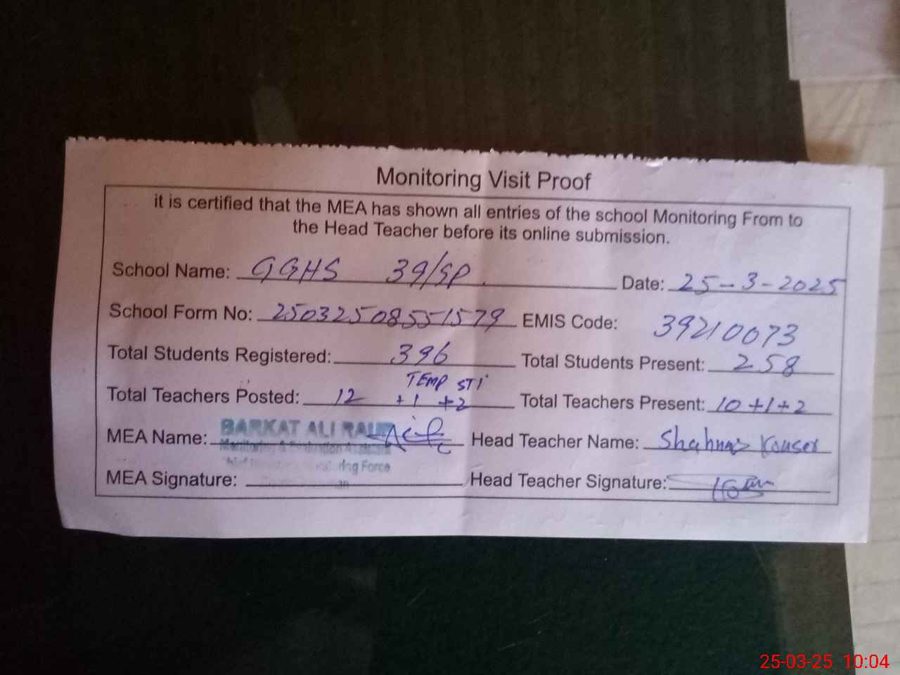 | Attendance Register | Head Teacher | MEA with School | Visit Proof |