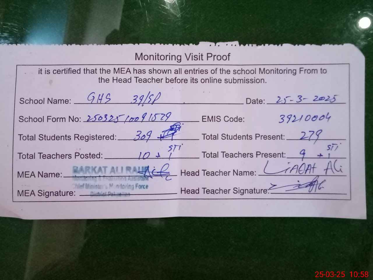 | EMIS Code: 39210004 | Name of School: GHS 39/S.P | |||