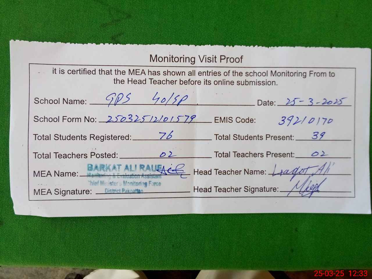 | EMIS Code: 39210170 | Name of School: GPS 40 SP | |||