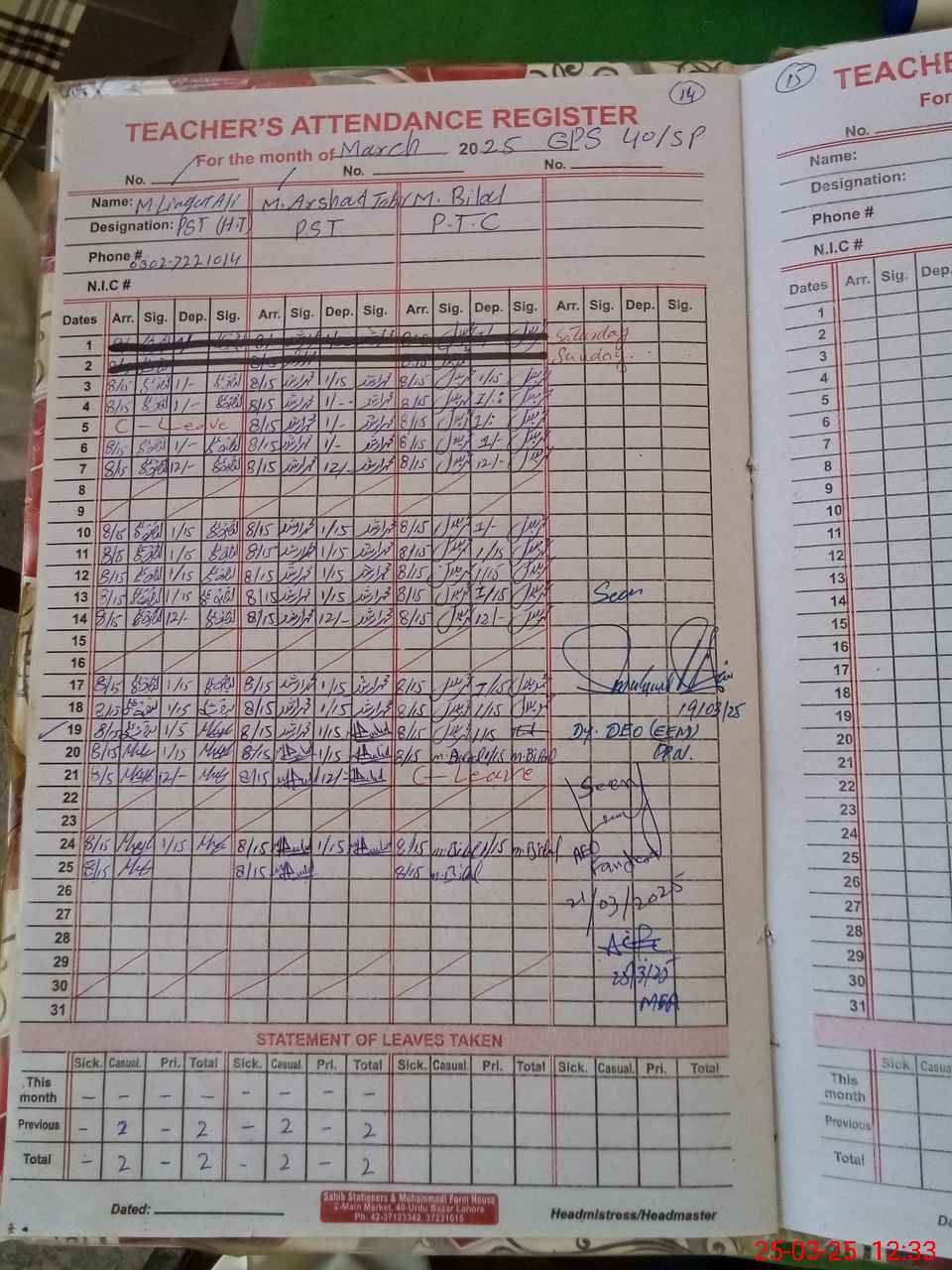 | Name: Li**** Al**** Designation: (School Headmaster's/Headmistress's) PST Phone/Cell Number: 03**** |