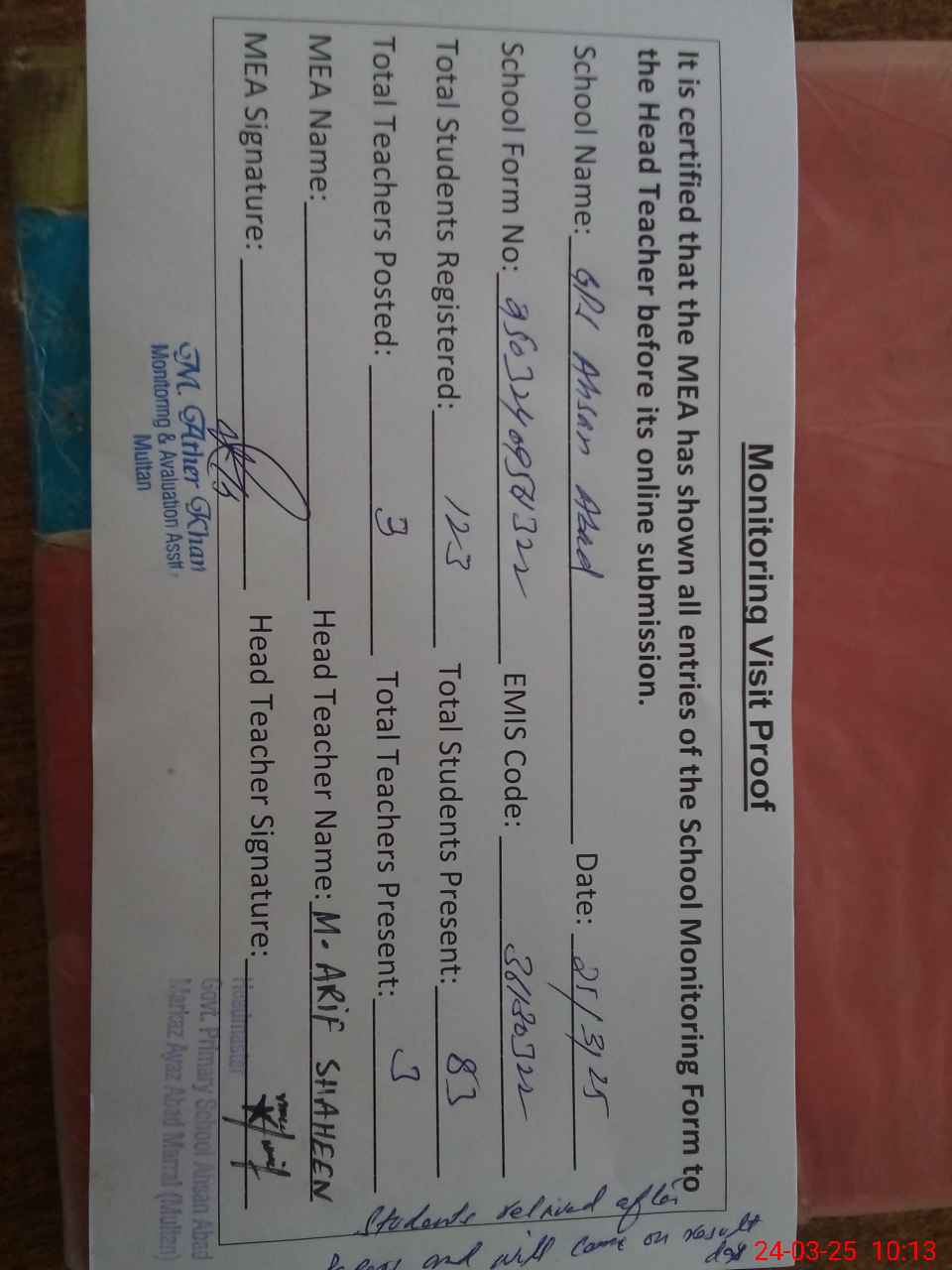 | Attendance Register | Head Teacher | MEA with School | Visit Proof |