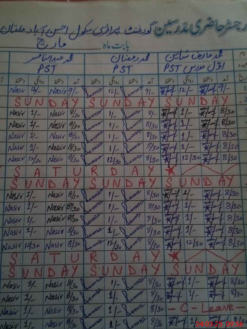 | CNIC | Full Name | Designation | R/C | Absence During Last Calender Month |