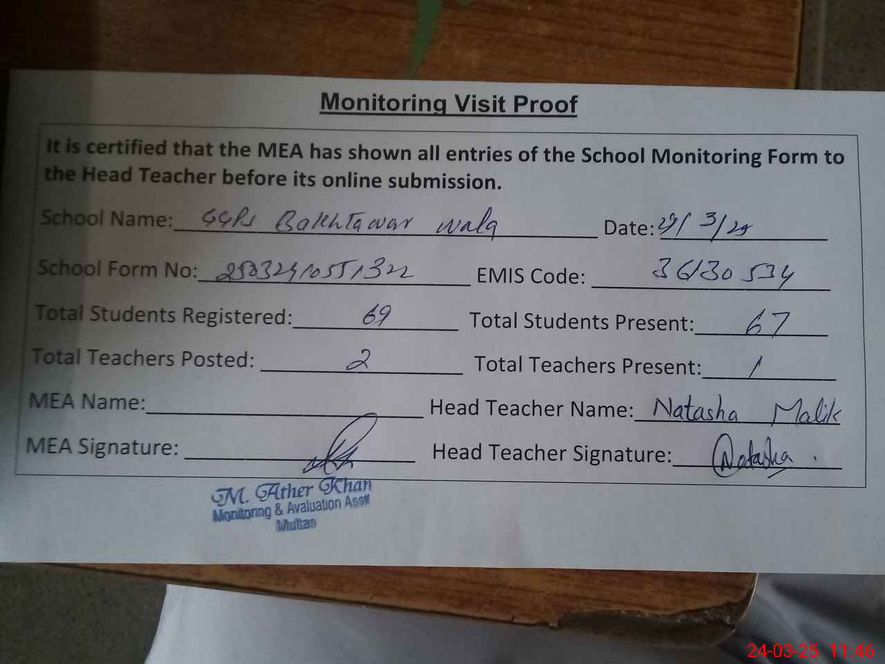 | EMIS Code: 36130534 | Name of School: GGPS BAKHTAWER WALA | |||