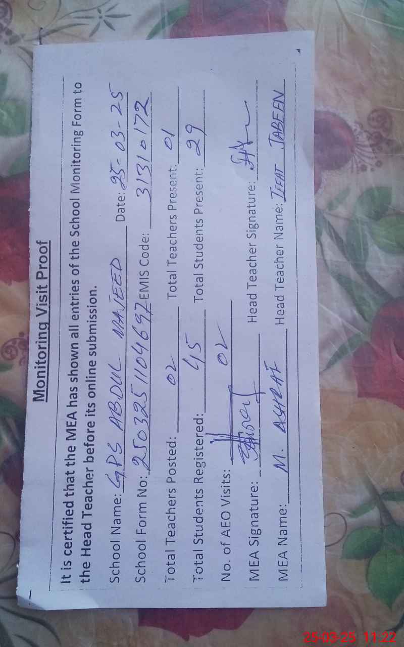 | EMIS Code: 31310172 | Name of School: GPS ABDUL MAJEED | |||