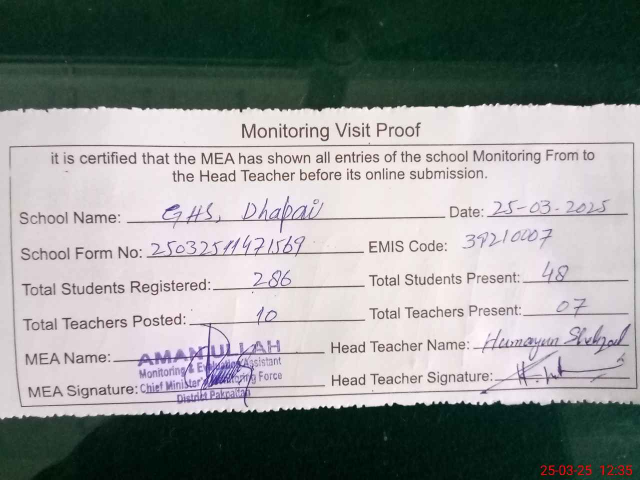 | EMIS Code: 39210007 | Name of School: GHS DHAPPAI | |||