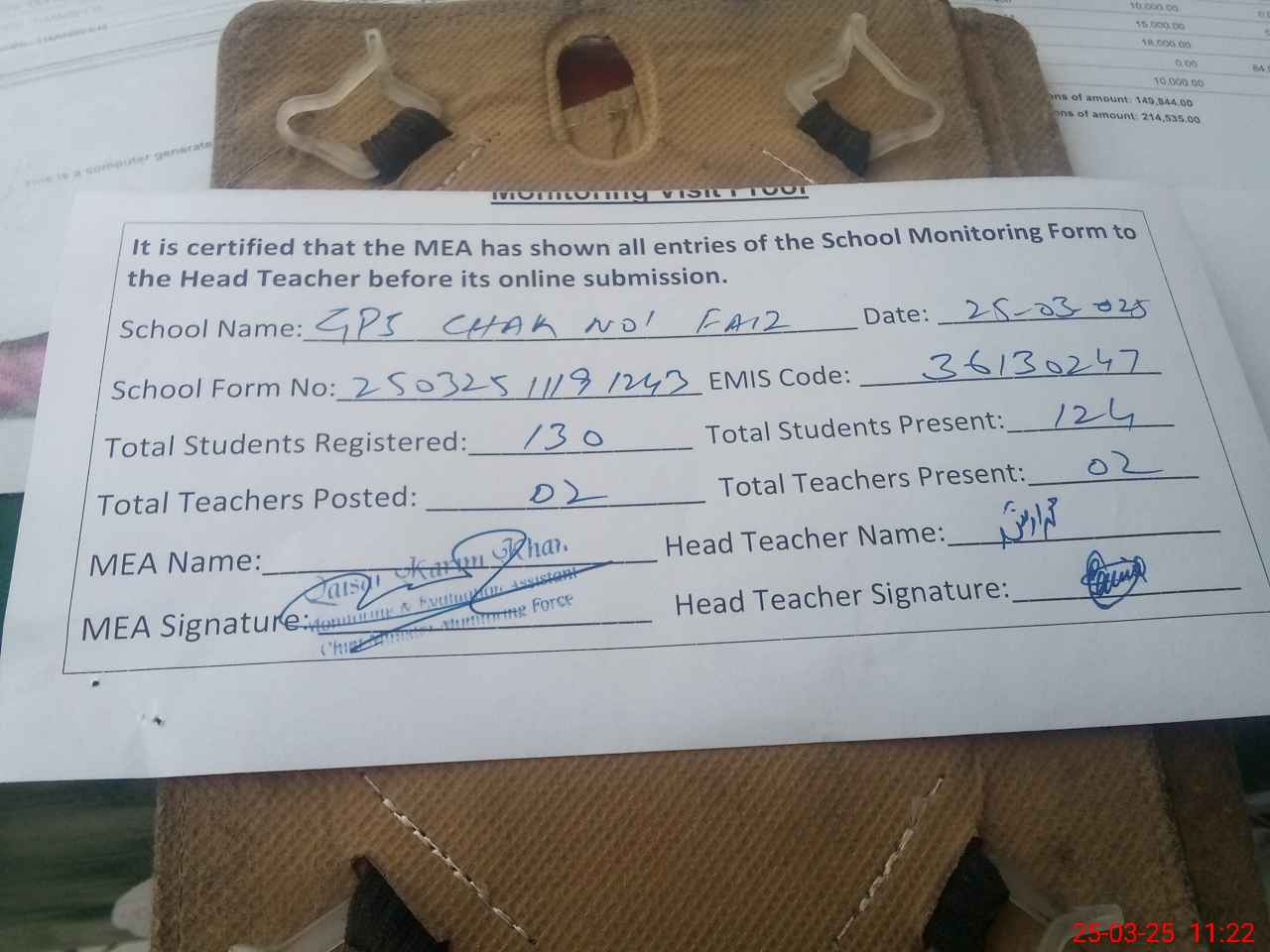 | Attendance Register | Head Teacher | MEA with School | Visit Proof |